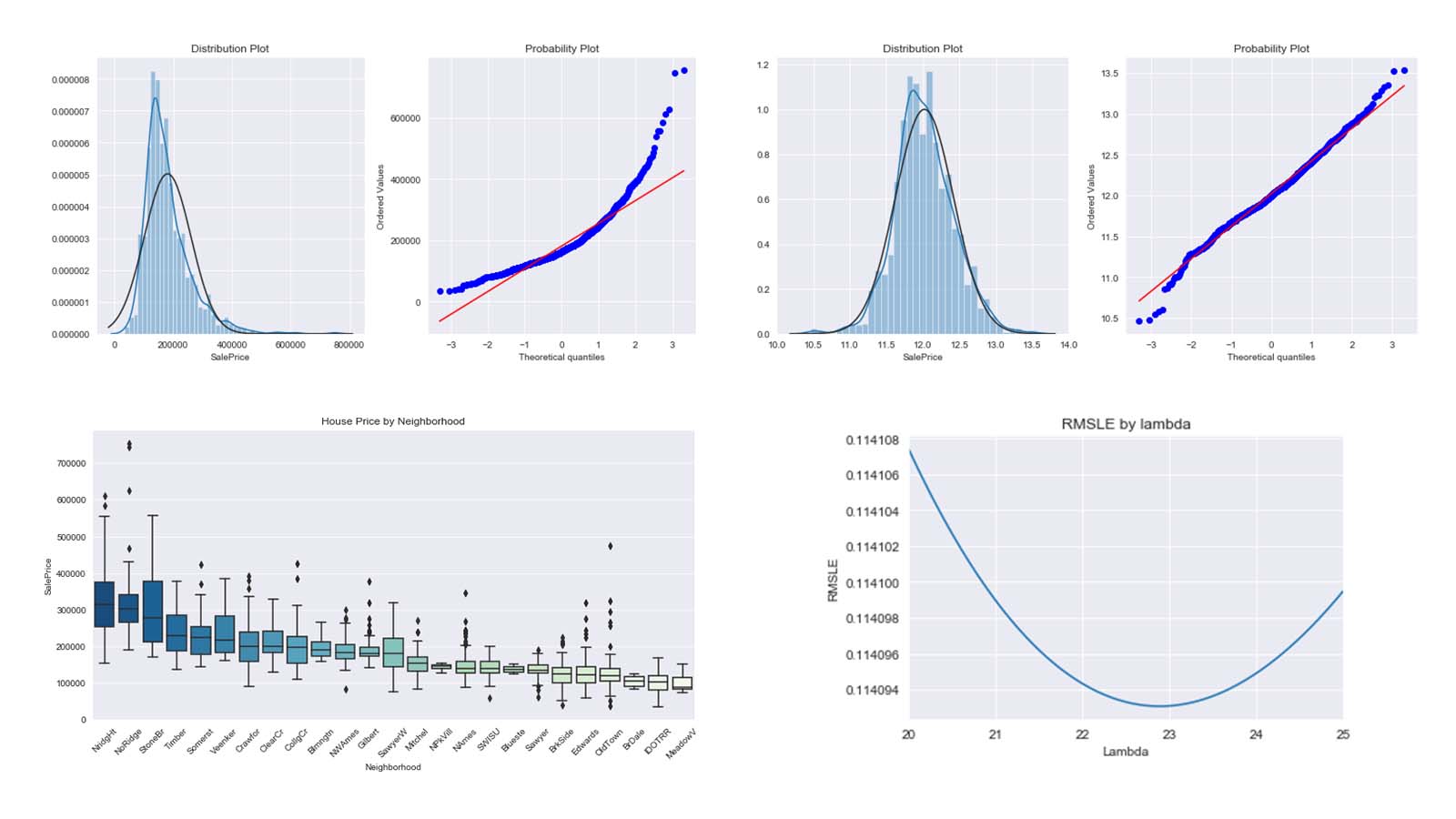 The prediction begins with exploratory data analysis and feature engineering. Random Forest and Gradient Boosting models (XGBoost, LightGBM) are then applied, achieving an RMSE of 0.12 (log-transformed target). Linear Regression and Ridge Regression are used for comparison, with Ridge reducing overfitting and yielding lower errors (MAE, MSE, RMSE). Significant features such as OverallQual, GrLivArea, and GarageCars were identified, providing valuable insights into the factors influencing house prices.